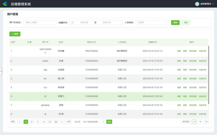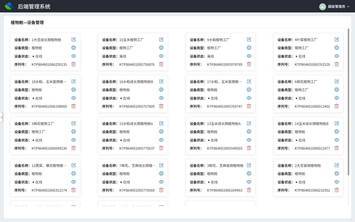 (2)人工氣候室數(shù)據(jù)列表:支持展示所有人工氣候室終端列表及基礎(chǔ)信息;支持展示人工氣候室設(shè)備狀態(tài):在線、離線;支持人工氣候室序列號查詢;支持新增/刪除終端數(shù)據(jù);支持編輯終端名稱;