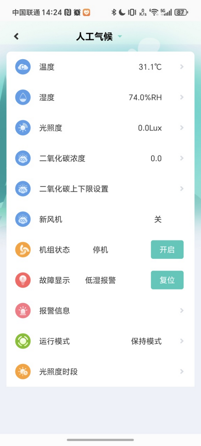 (2)設(shè)置管理:設(shè)置管理:新風(fēng)機(jī)設(shè)置:①支持新風(fēng)機(jī)狀態(tài)信息展示;②新風(fēng)機(jī)模式設(shè)置,支持保持模式和循環(huán)模式設(shè)置運(yùn)行時(shí)段;人工氣候室機(jī)組設(shè)置:①機(jī)組狀態(tài),顯示開啟或是關(guān)閉狀態(tài);②人工氣候室機(jī)組開關(guān)操作;運(yùn)行模式設(shè)置:①支持保持模式和時(shí)段模式設(shè)置人工氣候室內(nèi)溫、濕、光參數(shù);支持對同一艙內(nèi)的不同艙架單獨(dú)設(shè)置光照時(shí)段參數(shù);支持對定制光照可設(shè)置色值,控制燈光開關(guān)等;②故障顯示:展示當(dāng)前故障狀態(tài)信息;支持遠(yuǎn)程復(fù)位回到初始狀態(tài);數(shù)據(jù)分析:①實(shí)時(shí)環(huán)境數(shù)據(jù),展示人工氣候室內(nèi)溫度、濕度、光照度、二氧化碳等實(shí)時(shí)數(shù)據(jù);②歷史數(shù)據(jù)曲線分析,展示人工氣候室內(nèi)溫濕度、光照度、二氧化碳等歷史數(shù)據(jù)變化曲線圖,支持時(shí)間篩選歷史數(shù)據(jù);報(bào)警信息:①故障報(bào)警列表,展示歷史歷史故障信息,支持顯示報(bào)警內(nèi)容及報(bào)警時(shí)間;②清除當(dāng)前記錄,支持一鍵清除所有歷史記錄報(bào)警信息;;