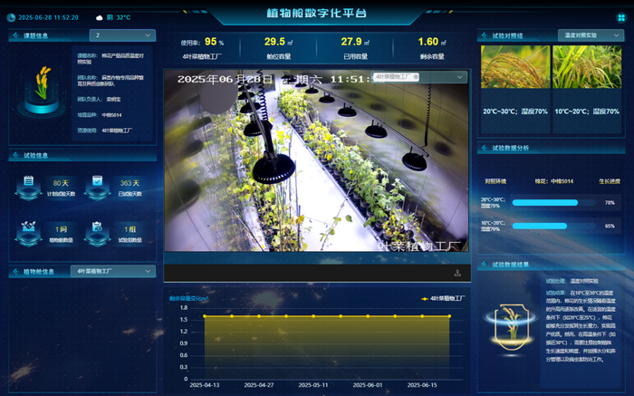 (2)數(shù)字化氣候室:課題信息詳情展示:課題團(tuán)隊(duì)、氣候室資源使用情況;試驗(yàn)信息試驗(yàn)天數(shù)、試驗(yàn)組數(shù)量、人工氣候室使用數(shù)量;人工氣候室實(shí)時(shí)信息,運(yùn)行狀態(tài)、實(shí)時(shí)溫濕度、光照、二氧化碳等數(shù)據(jù)展示:人工氣候室使用率統(tǒng)計(jì)、艙位容量狀態(tài),以曲線圖方式分析歷史艙位容量數(shù)據(jù)變化趨勢;支持展示試驗(yàn)對照組信息,作物試驗(yàn)照前后圖片直觀對比;支持對照組生長情況對比;支持展示試驗(yàn)數(shù)據(jù)結(jié)構(gòu)信息,試驗(yàn)處理方式、試驗(yàn)結(jié)果信息。